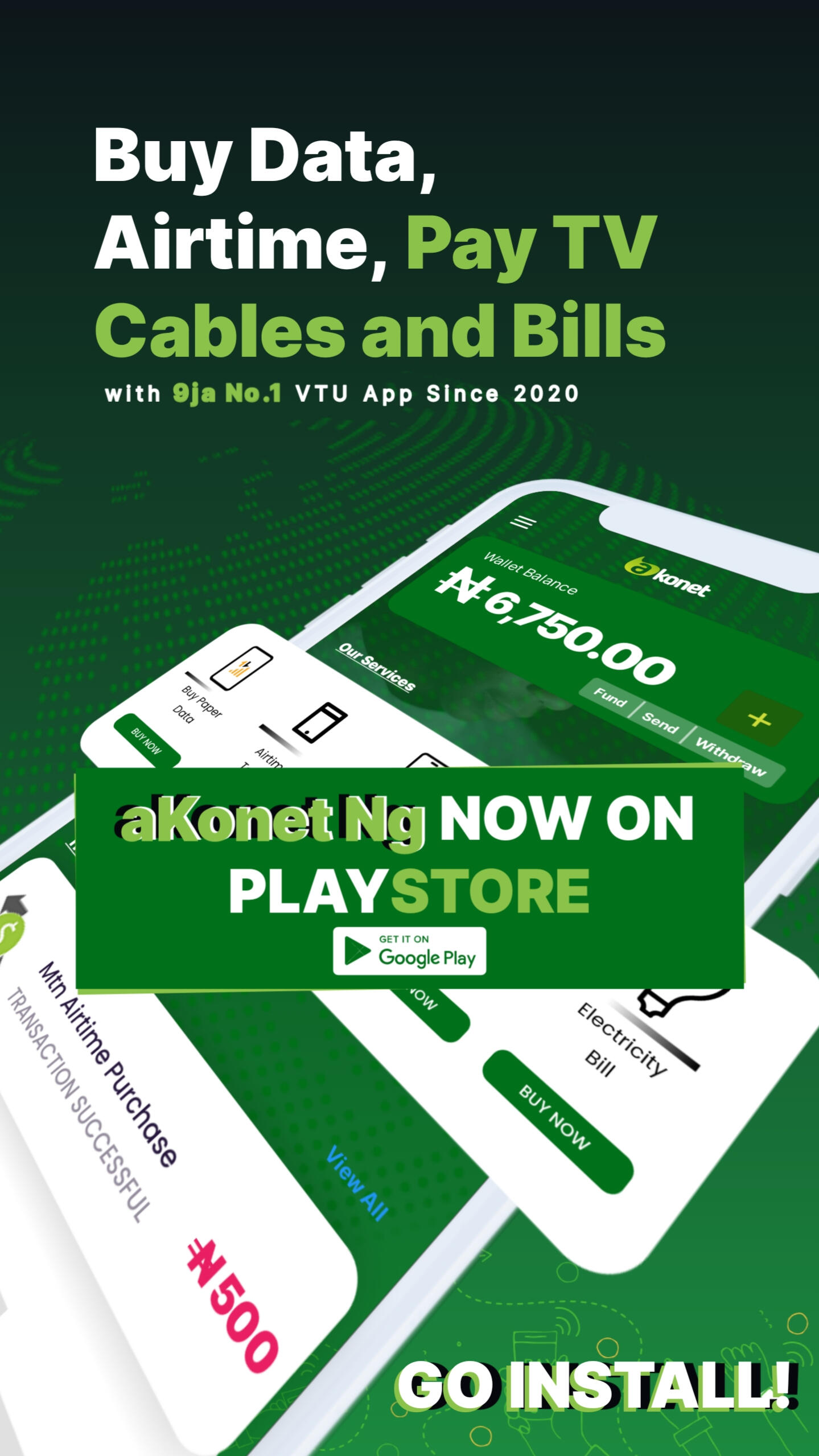 Download aKonet now!Available on playstoreπWelcome to aKonet; The leading Nigeria VTU Platform created to breakout the arising demand of utilities and bills payment all across the nation.You can buy and resell Airtime, Data bundles, pay Electricity and other utilities bills, buy WAEC, NECO, JAMB, NABTEB and many other Educational E-pin, Mega Data, Offline Data, Airtime to Cash, Printable Recharge cards pin of all network and many other services all at a very cheap rate.WHY CHOOSE aKonet
